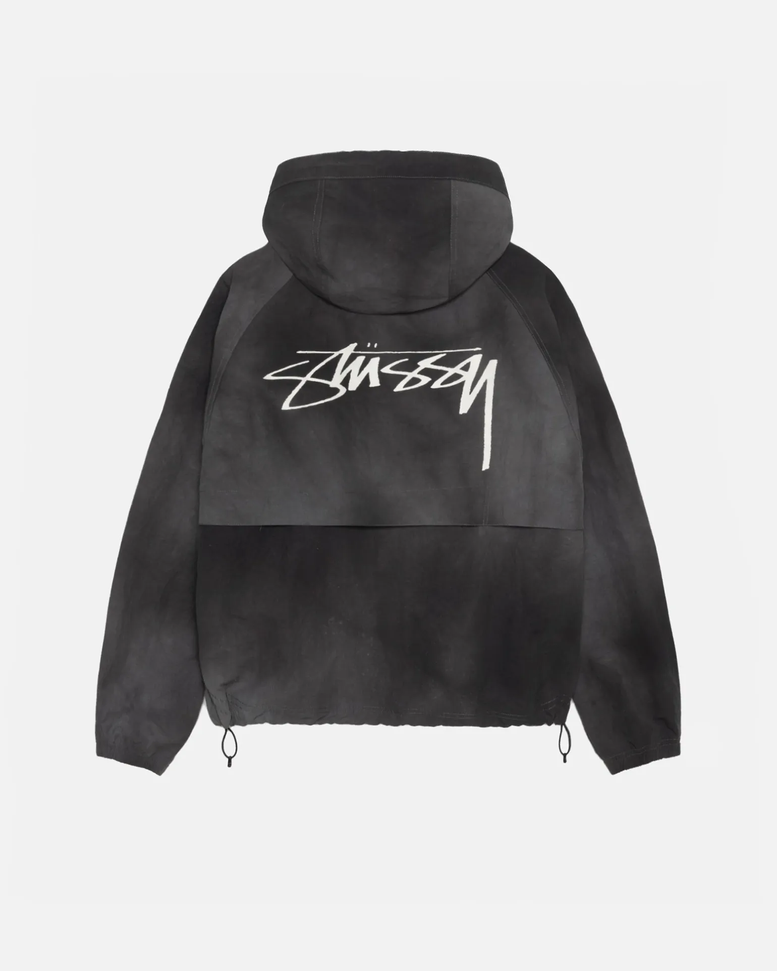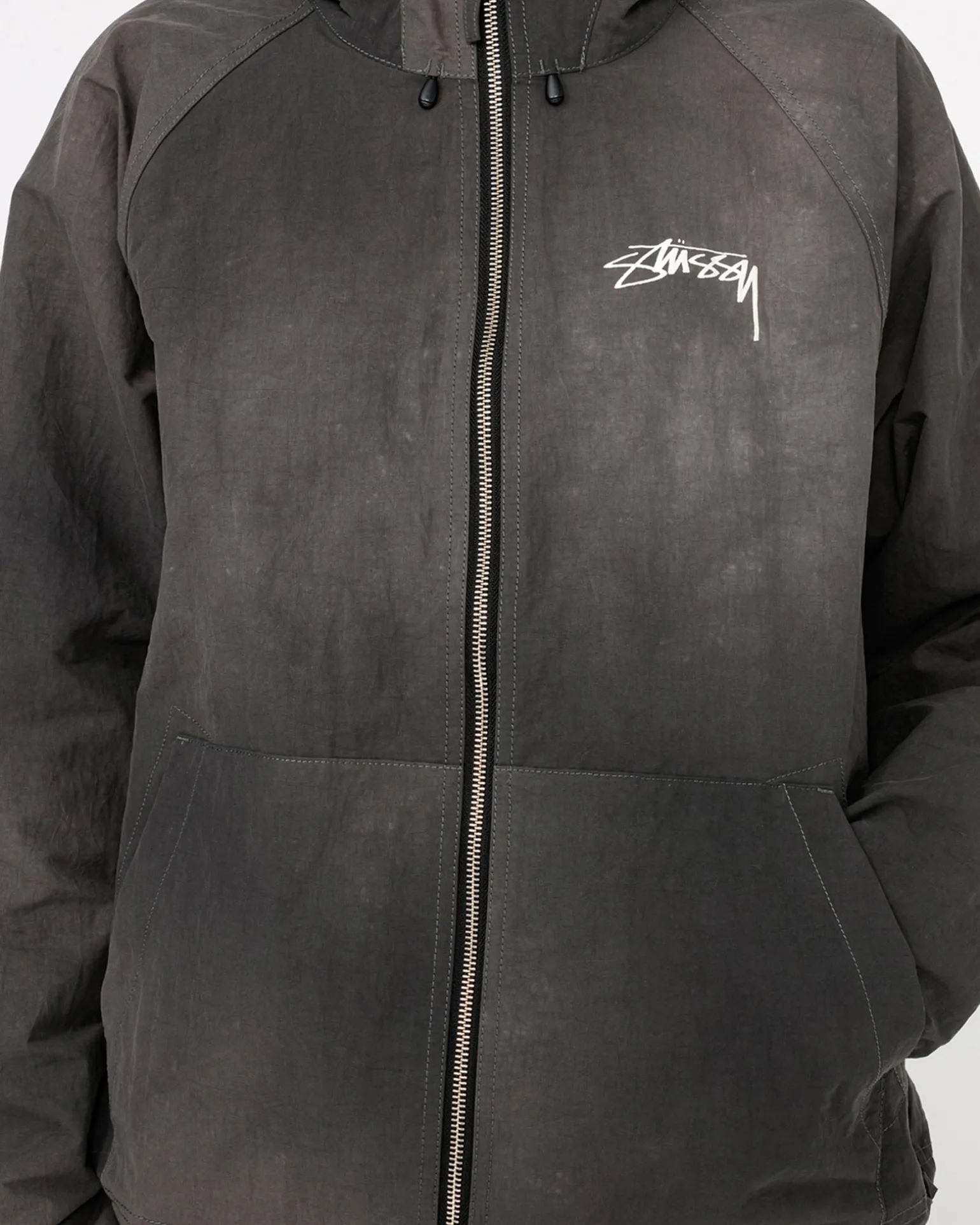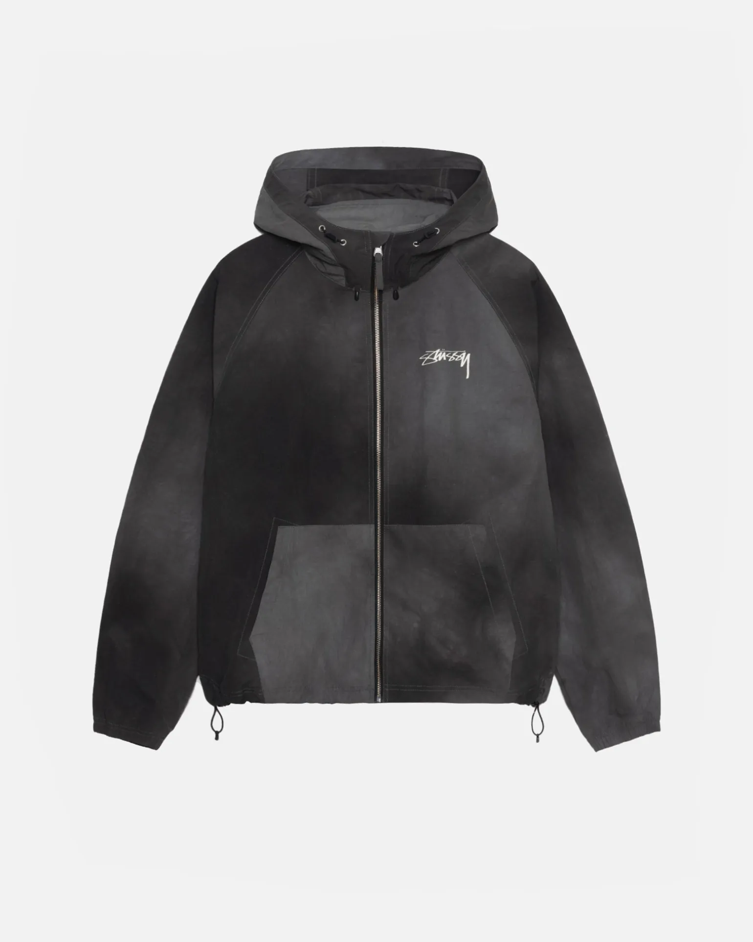 Relaxed shell jacket in textured wave dyed nylon. Features a front zip closure with adjustable drawcords in the hood and hem. Stüssy smooth stock logo printed at the left chest and across the back.