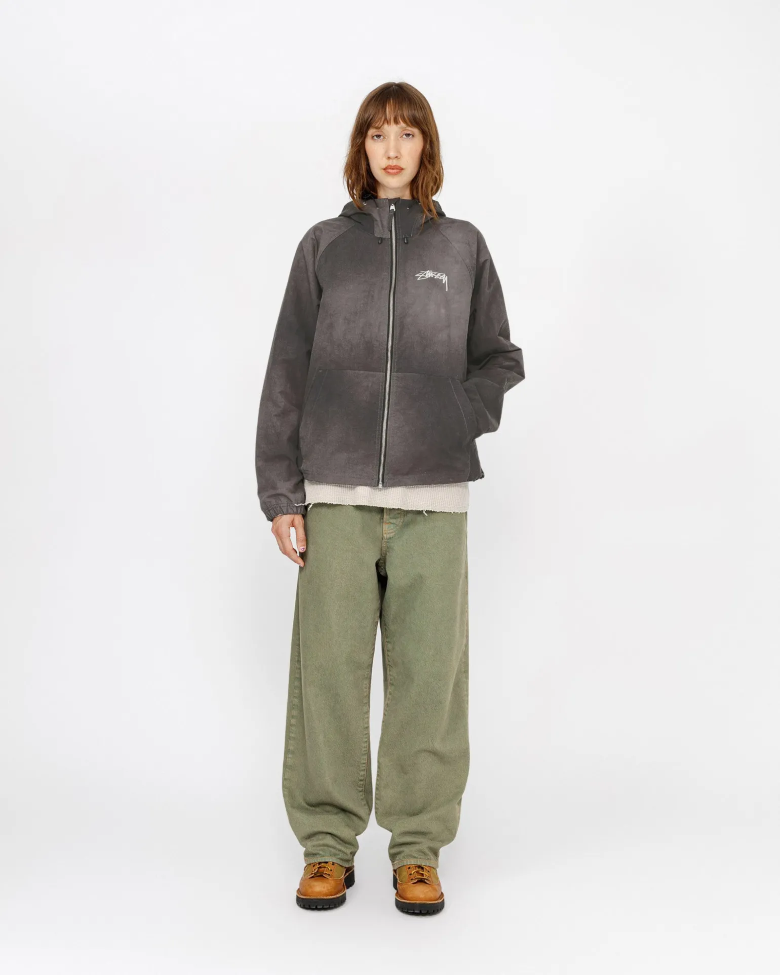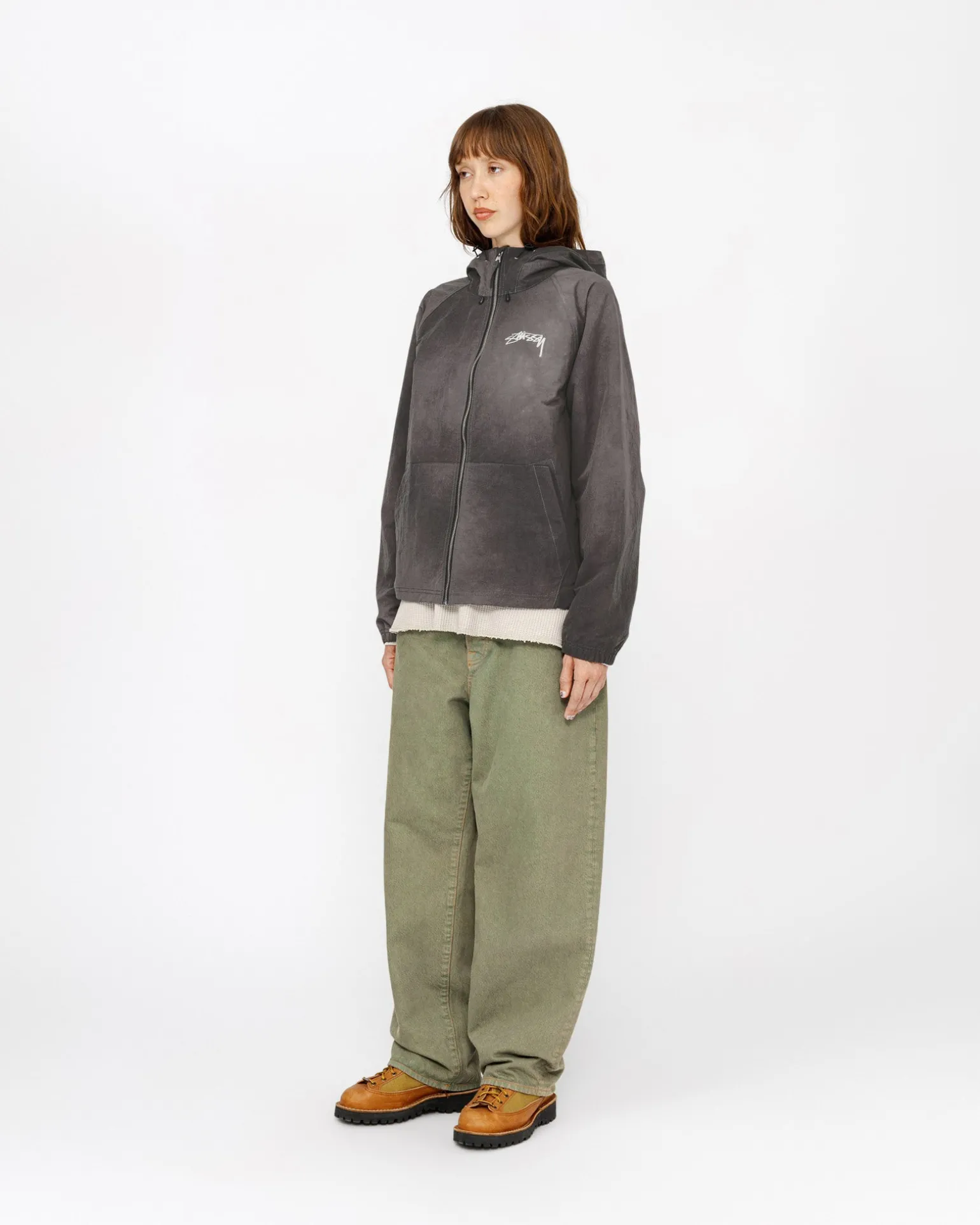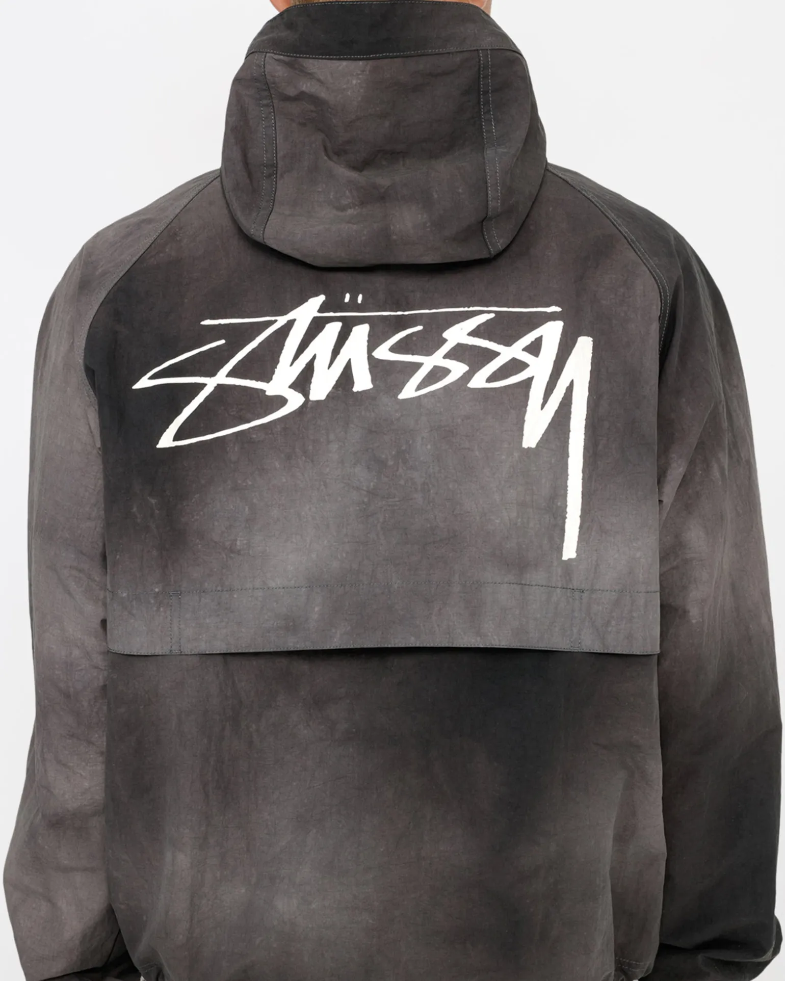 Relaxed shell jacket in textured wave dyed nylon. Features a front zip closure with adjustable drawcords in the hood and hem. Stüssy smooth stock logo printed at the left chest and across the back.