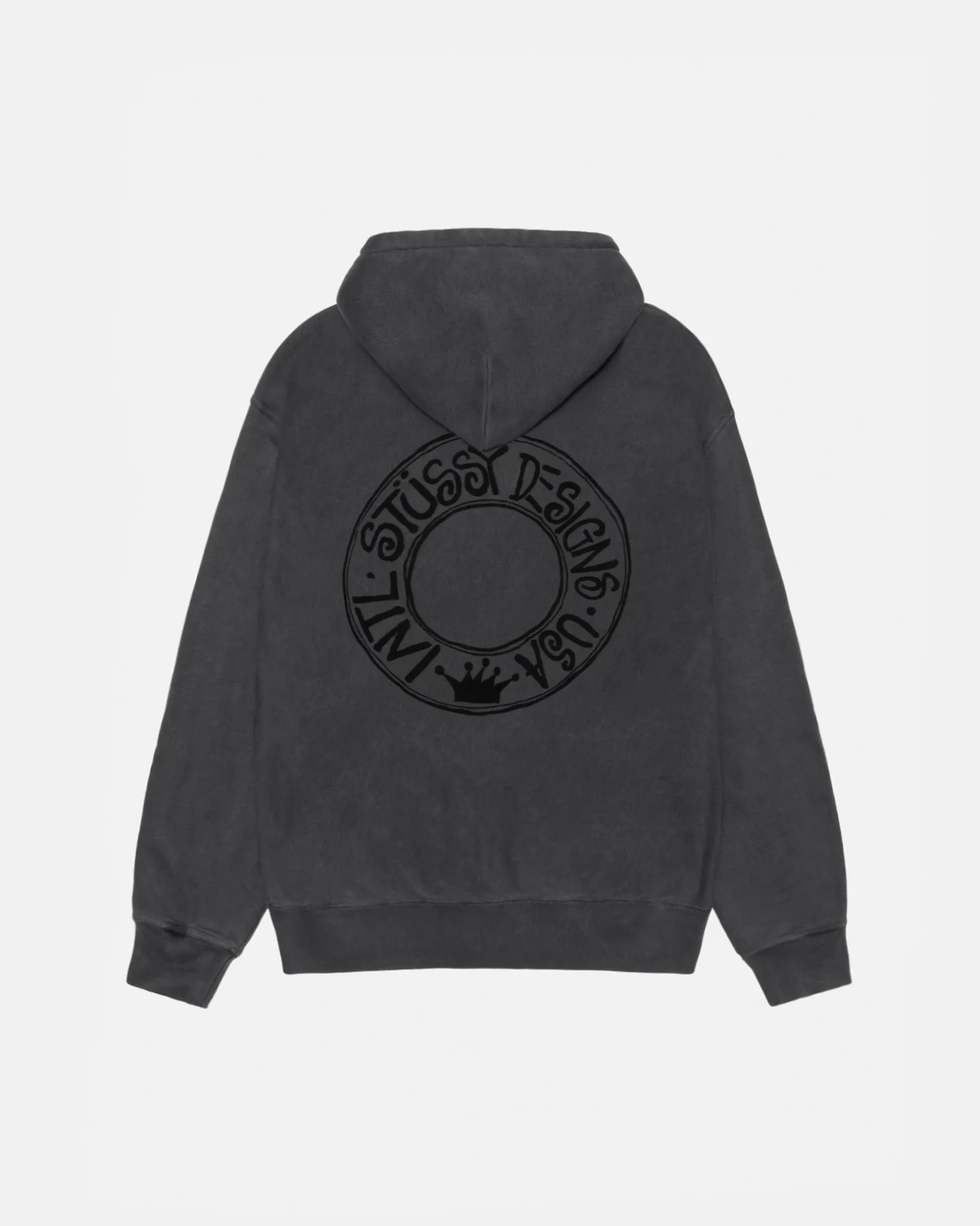 Relaxed pigment dyed sweatshirt in heavy 14oz cotton fleece. Features a zip closure, kangaroo pocket and brushed interior. Screenprinted using water-based ink for a soft hand feel.