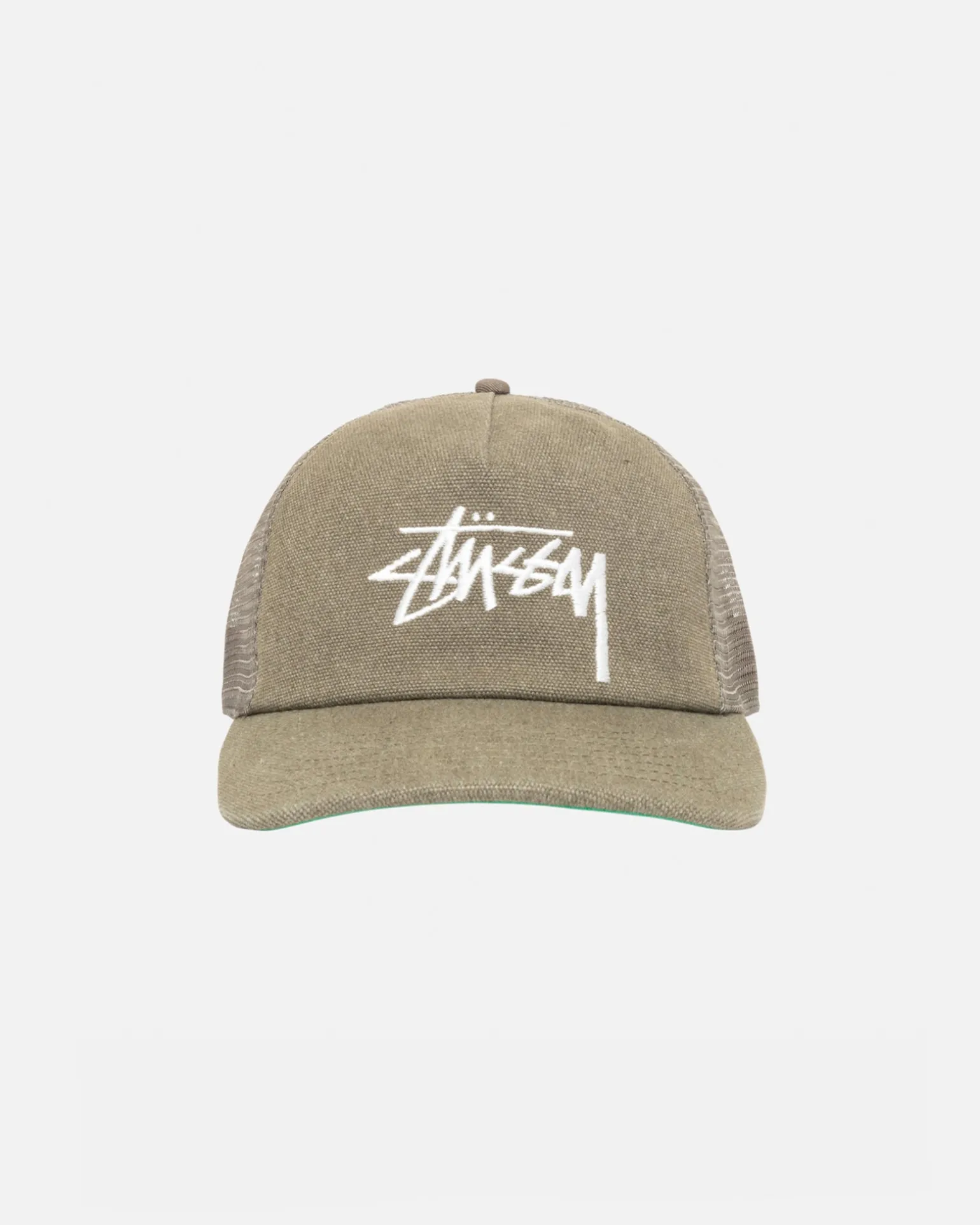 Mid-depth five panel cotton twill cap with mesh. Stüssy stock logo embroidered across the front.