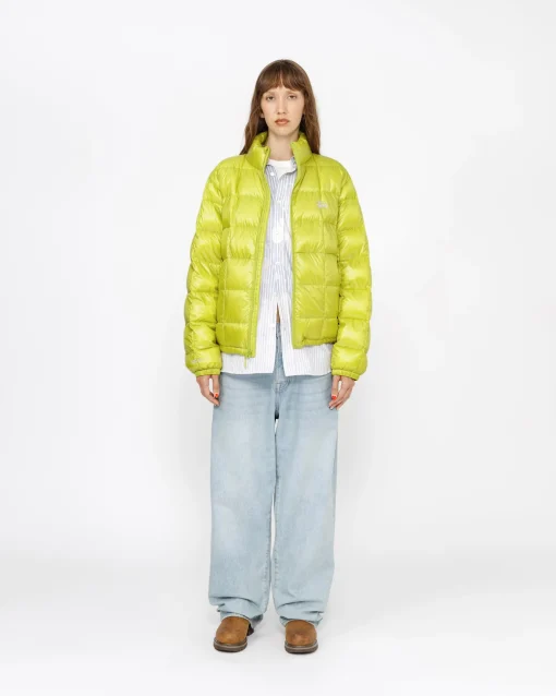 Relaxed fit puffer jacket in water-repellent recycled nylon with a slight luster. Features 600-fill midweight quilted down and a zip front closure. Stüssy basic stock logo embroidered at the front. Fits true-to-size as an outer layer, order one size down to wear as a mid-layer.