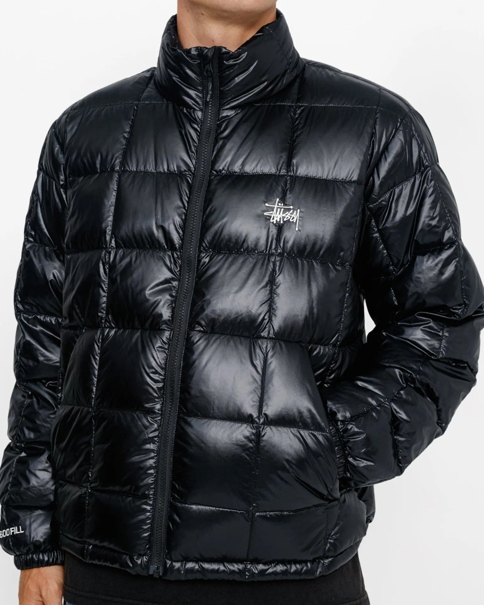 Relaxed fit puffer jacket in water-repellent recycled nylon with a slight luster. Features 600-fill midweight quilted down and a zip front closure. Stüssy basic stock logo embroidered at the front. Fits true-to-size as an outer layer, order one size down to wear as a mid-layer.