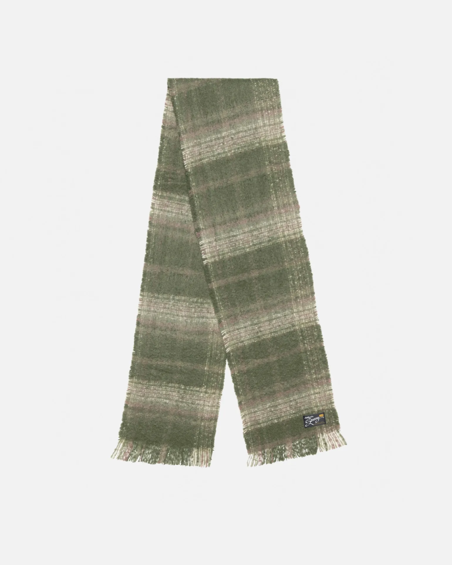 Plaid scarf with fringed edges. Stüssy authentic label stitched at the end.