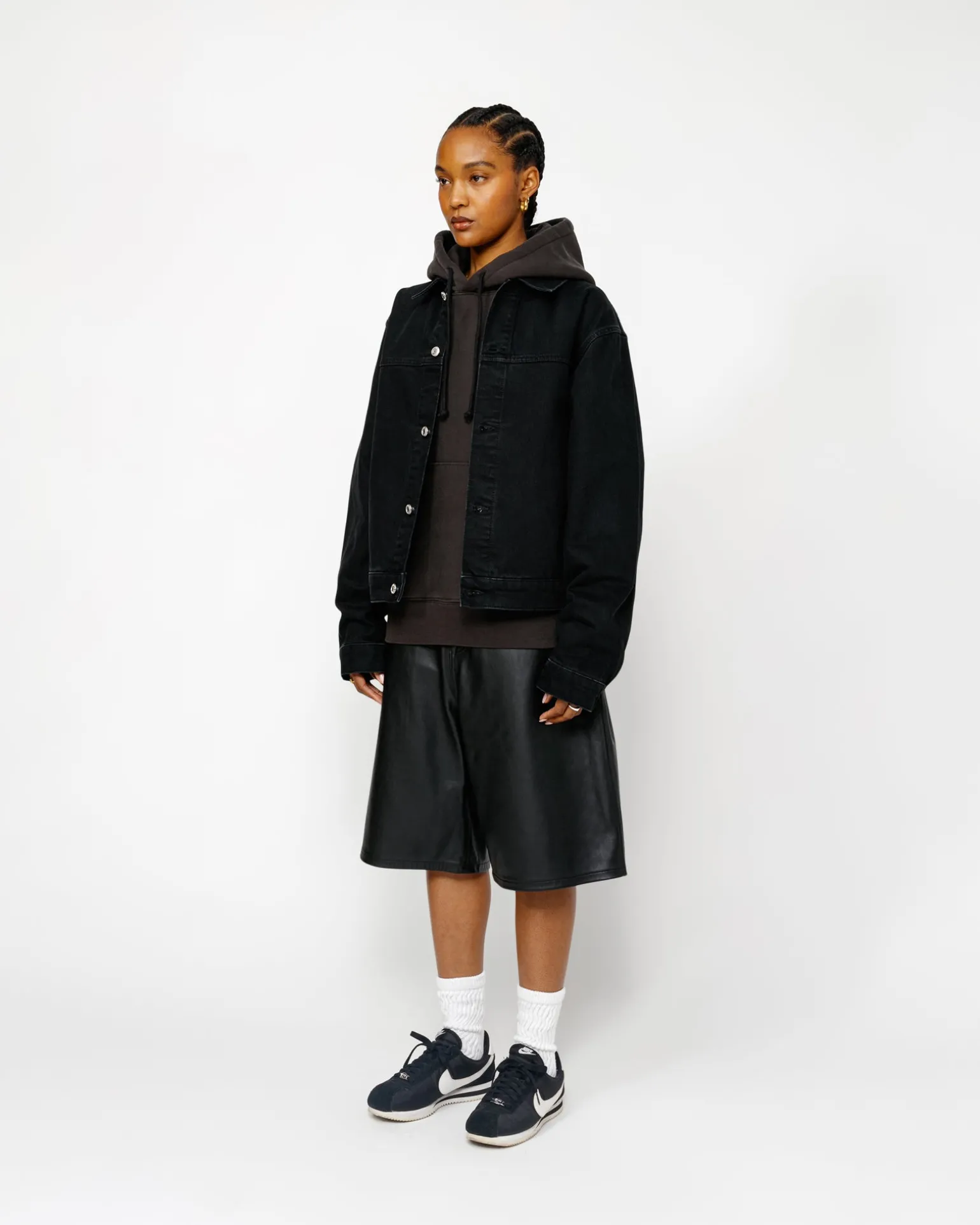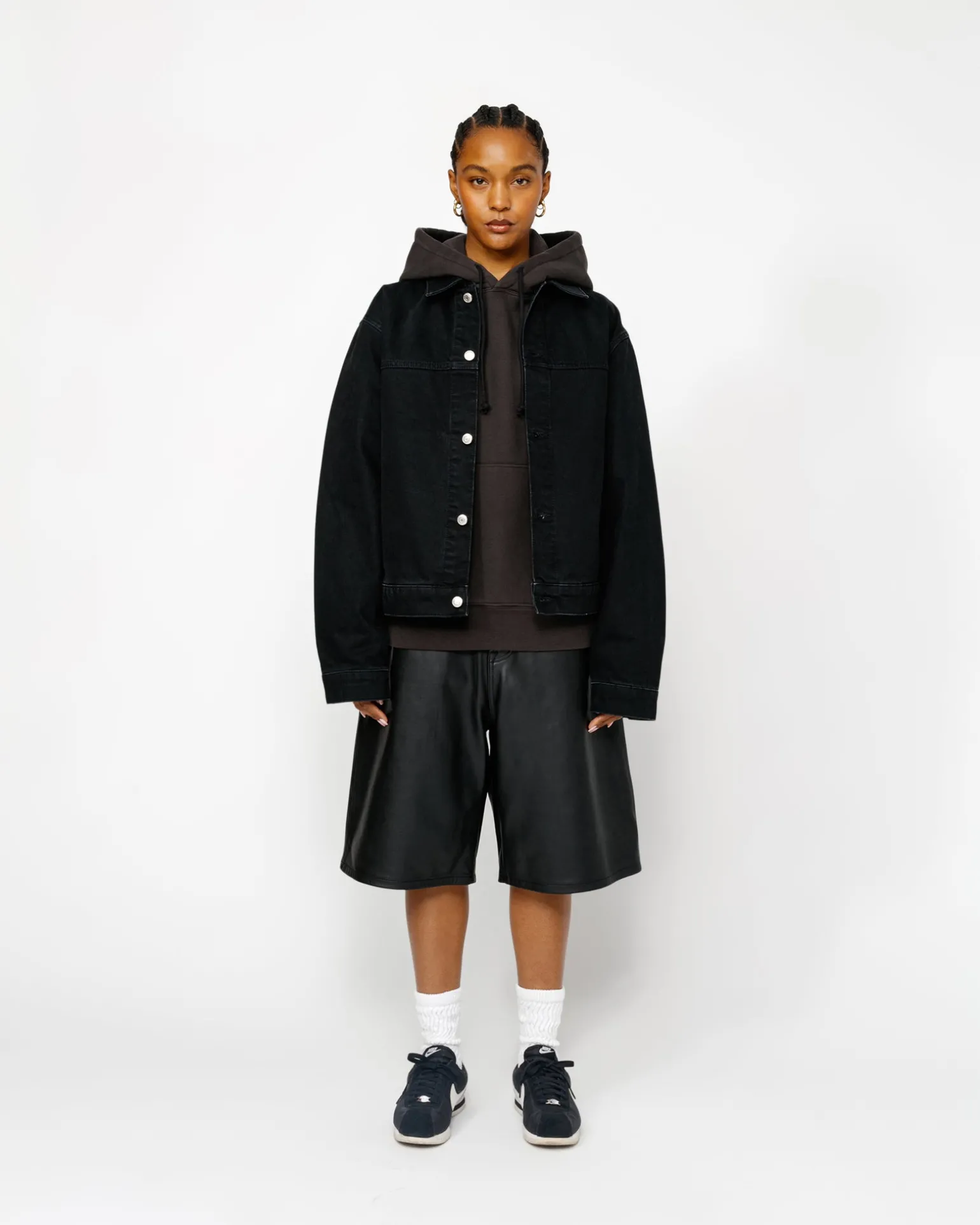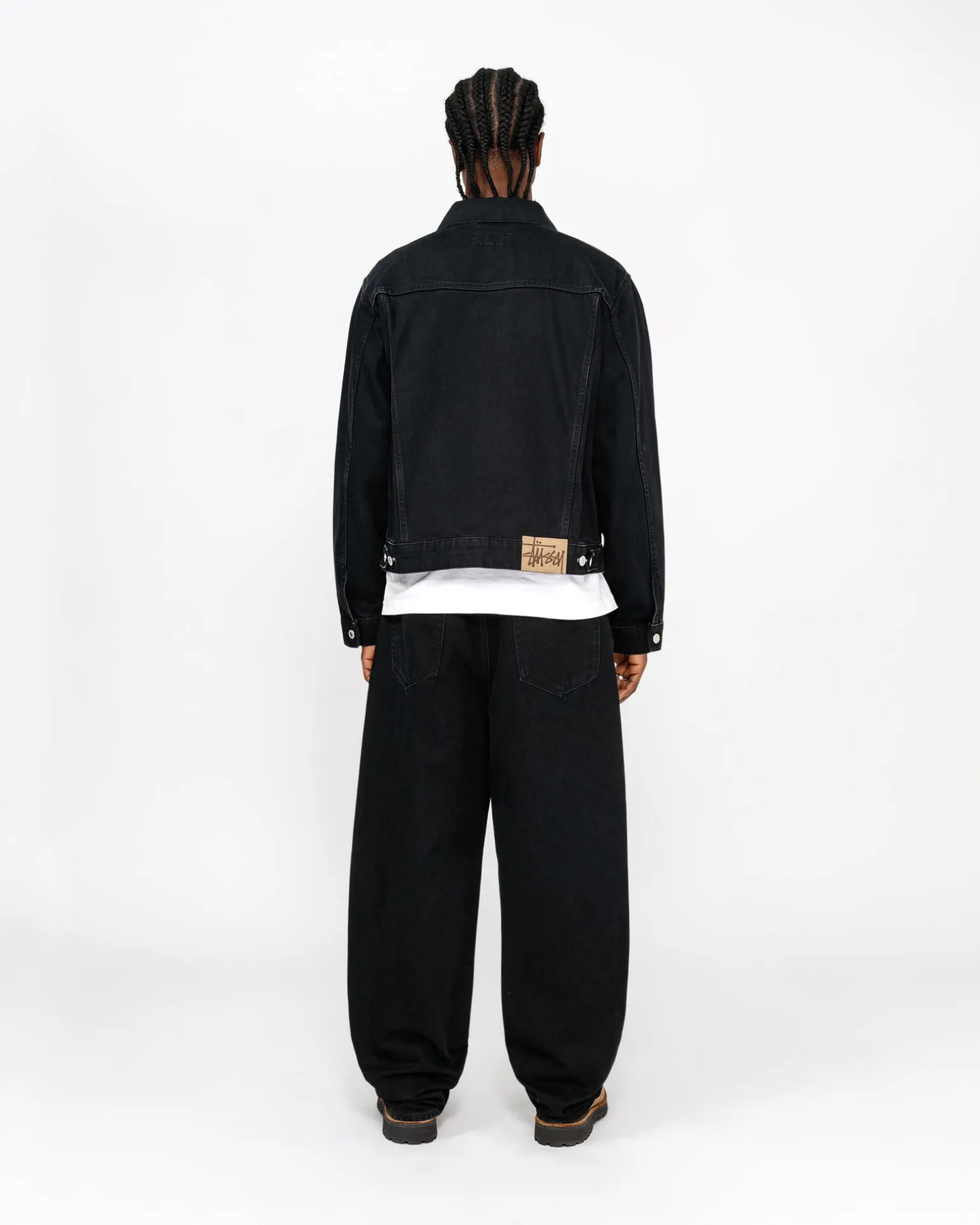 Trucker jacket in 14.5oz cotton denim with a relaxed boxy fit. Features branded nickel shank hardware and a suede Stüssy logo patch.