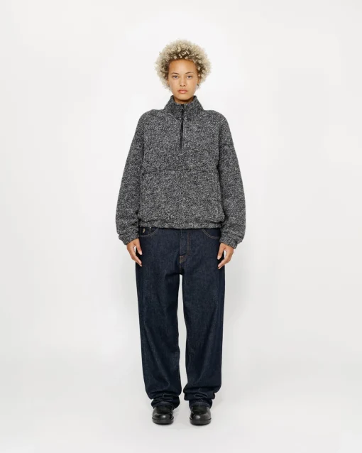 Classic fit half zip in a heavy textured wool cotton blend. Features a mock neck collar and front zip pocket, both fleece-lined.