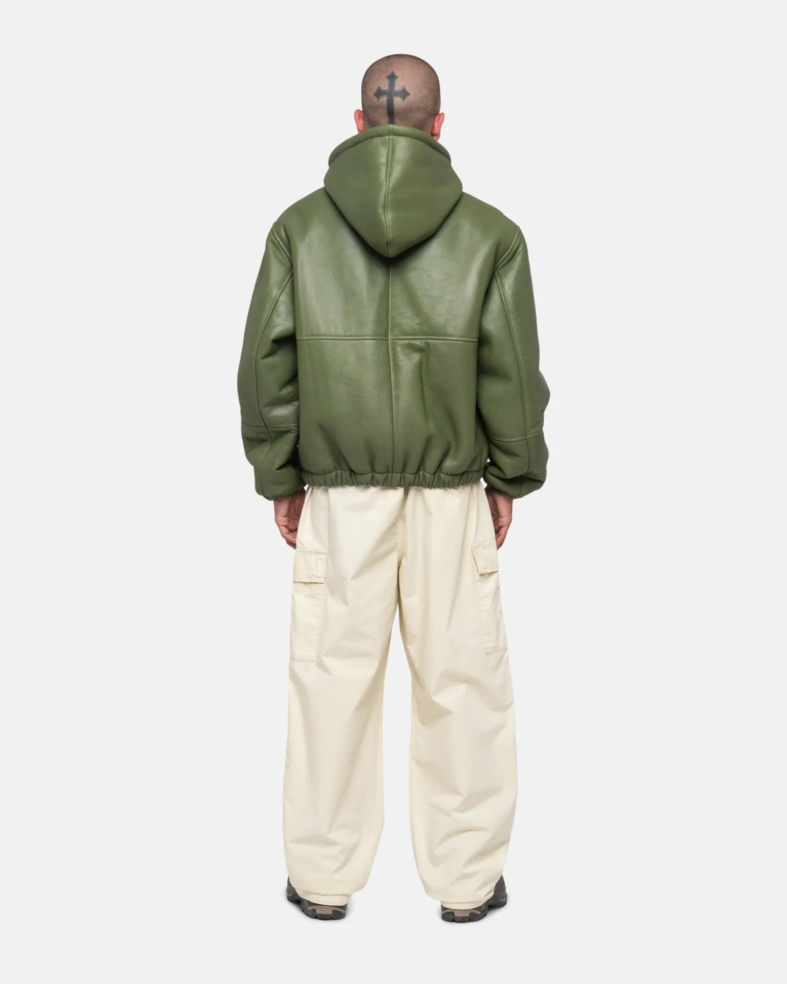 Soft-grain leather work jacket with shearling fleece lining.