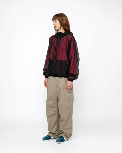 Relaxed shell jacket in transparent ripstop fabric. Features a front zip closure with adjustable drawcords in the hood and hem. Tonal Stüssy smooth stock logo printed at the left chest and across the back.