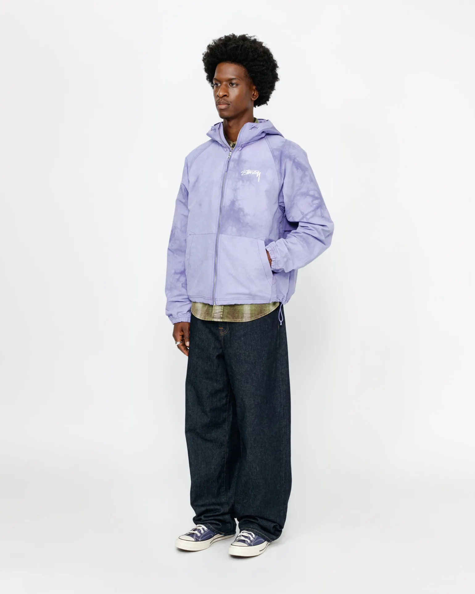 Relaxed shell jacket in textured wave dyed nylon. Features a front zip closure with adjustable drawcords in the hood and hem. Stüssy smooth stock logo printed at the left chest and across the back.