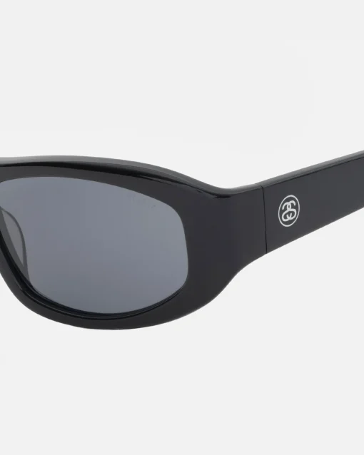 Acetate sunglasses with a wrap-around shape and tinted lenses. Stüssy SS link metal plate inset at the temples and eyegear logo at the inside.