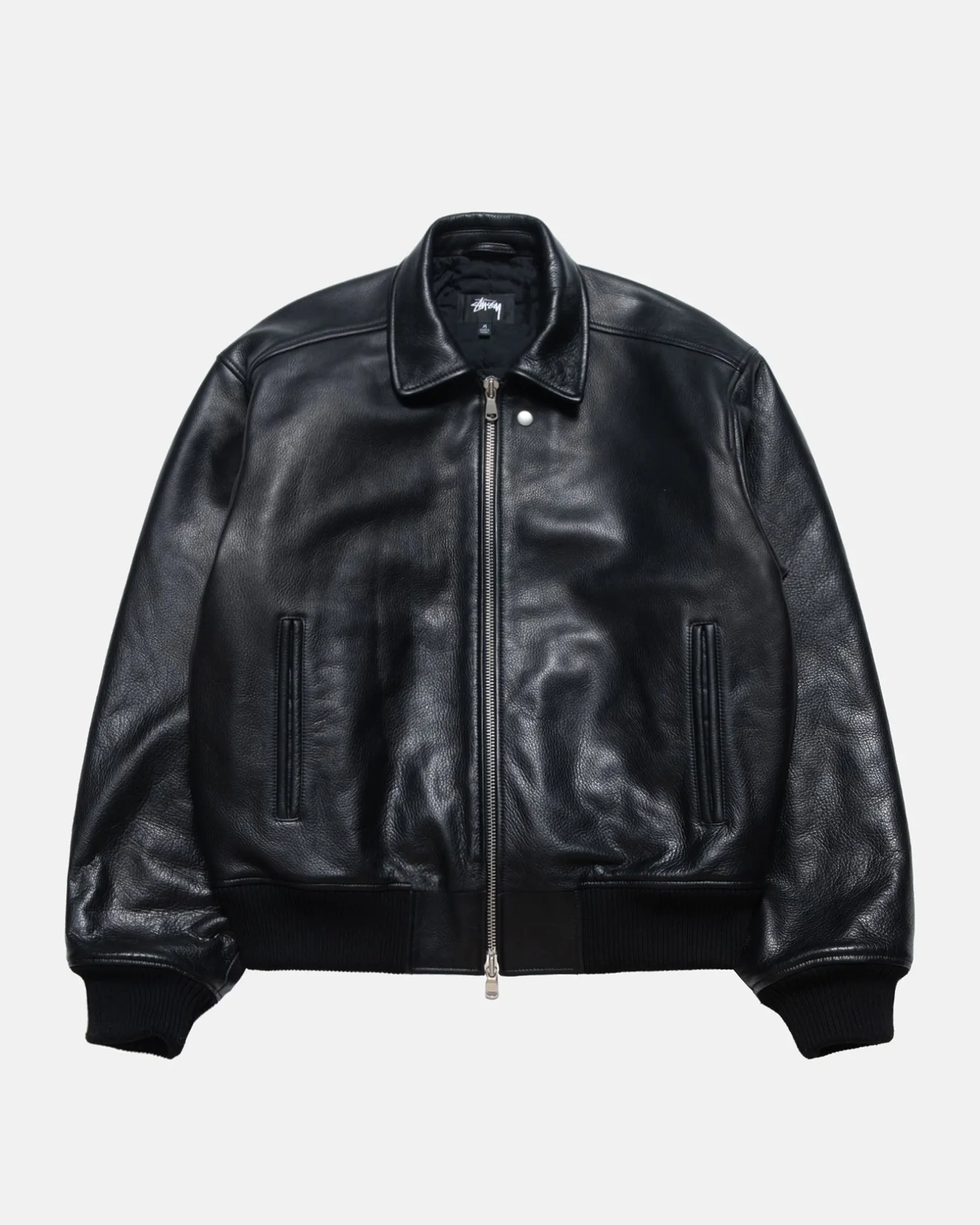 Relaxed fit flight jacket in leather lined with quilted padding. Features a zip front closure, double welt pockets and ribbing at the cuffs and hem. Stüssy swirly “S” debossed on the zip guard.