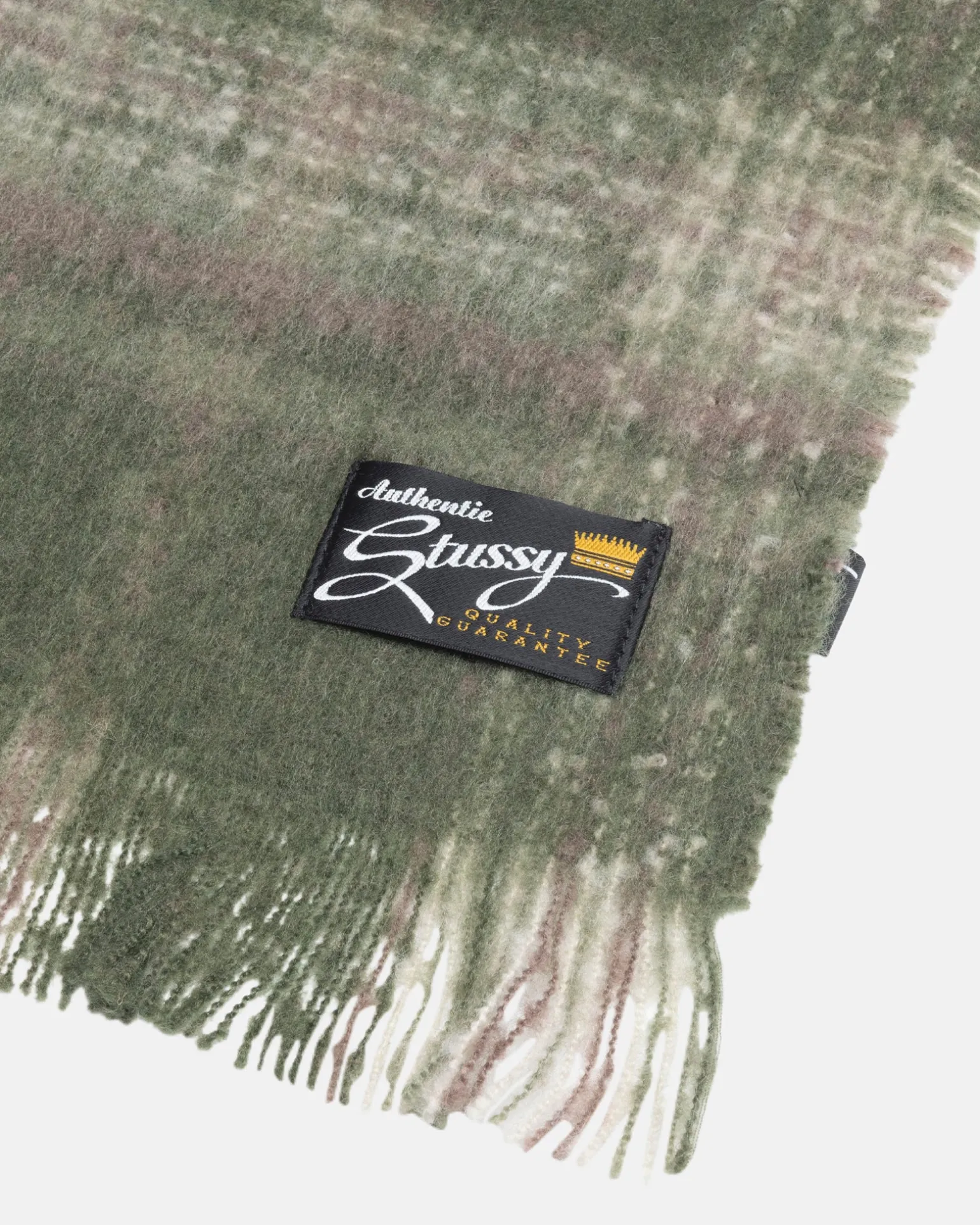 Plaid scarf with fringed edges. Stüssy authentic label stitched at the end.