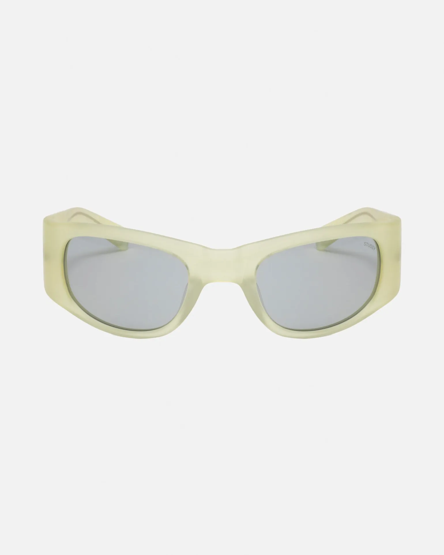 Acetate sunglasses with a wrap-around shape and tinted lenses. Stüssy smooth stock logo at the outside temple and eyegear logo inside.