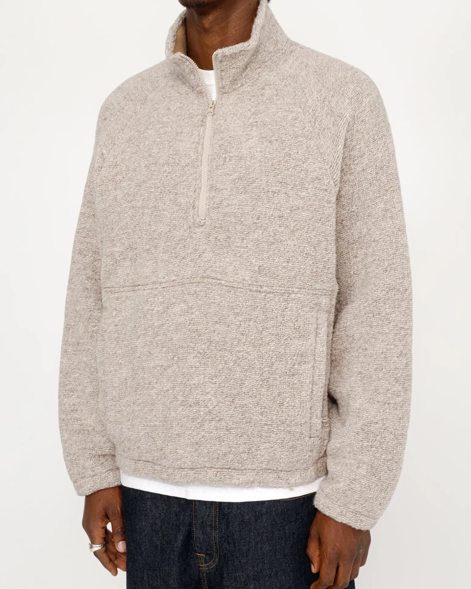 Classic fit half zip in a heavy textured wool cotton blend. Features a mock neck collar and front zip pocket, both fleece-lined.