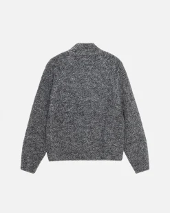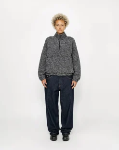 Classic fit half zip in a heavy textured wool cotton blend. Features a mock neck collar and front zip pocket, both fleece-lined.