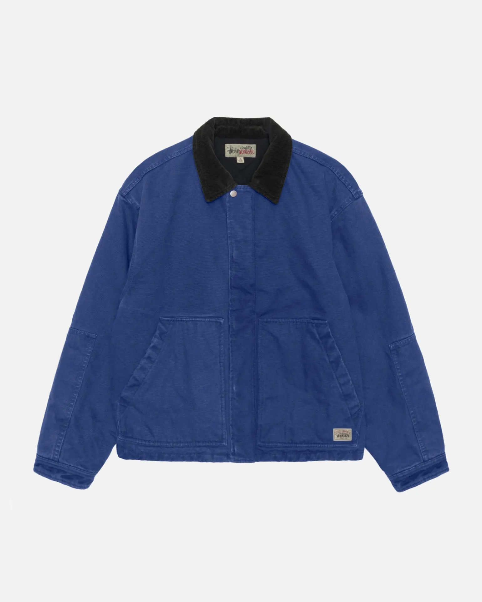 Work jacket in cotton canvas lined with quilted quilting. Boxy fit featuring a corduroy collar, concealed zip closure, patch pockets, and a garment dye with stonewash treatment. Stüssy workgear label stitched at the side.
